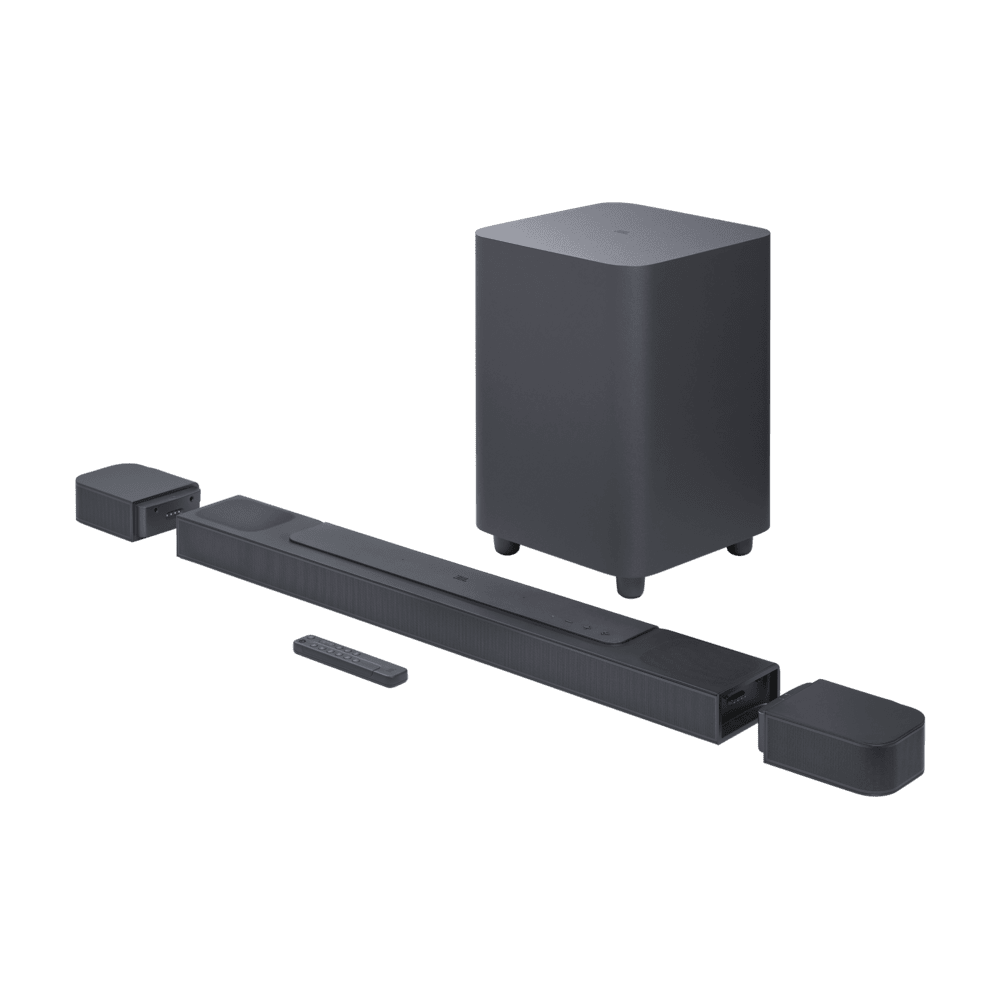 - JBL Bar 1000 Soundbar, Experience movies, music, and games with a sound that puts you right in the middle of the action, thanks to 880W of total output power and thunderous bass from the 10″ subwoofer.
